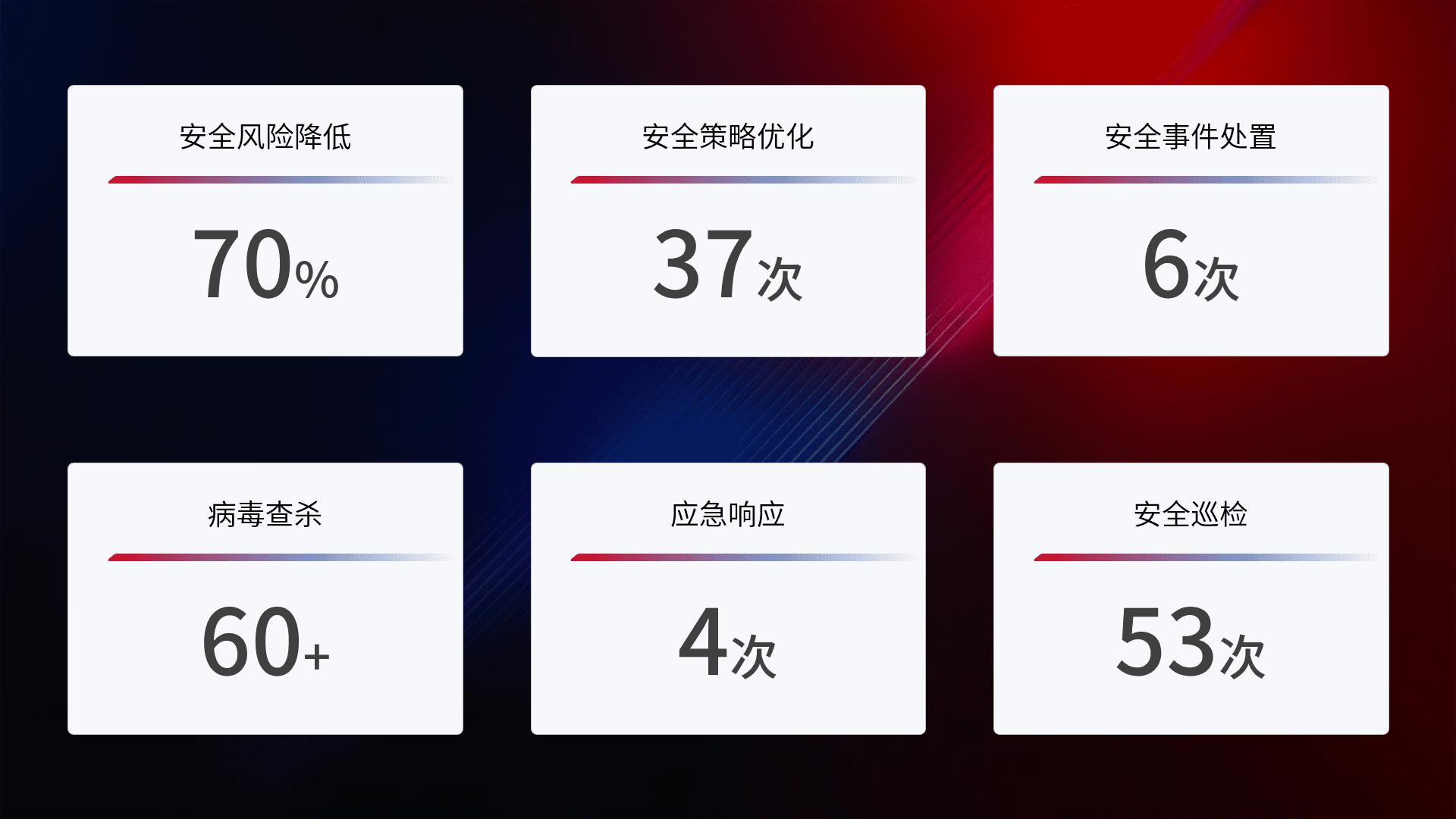 提供全面的安全事件报告体系,,,,包括处置报告、、、周报、、季度和年度总结,,,结合持续监控,,,,帮助客户深入了解网络安全状况。。。